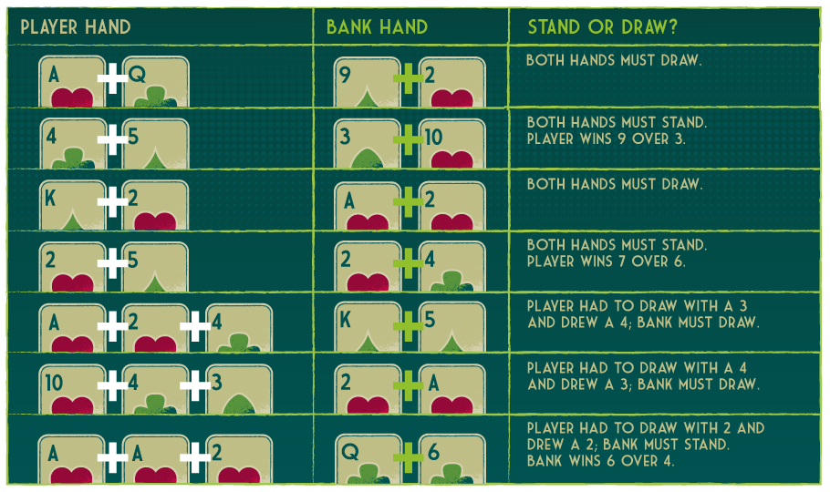 - There are house rules that determine whether the bank or player hand receives a third draw card. (there is a maximum of three cards per hand.)