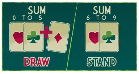 - Player hand draws a third card if the initial two cards total 0 to 5.
