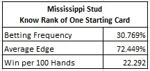 I do not know how Mississippi Stud (MS) has survived its crushing vulnerabilities to cheating and advantage play. Hole-carding gives the AP an edge from 55% to 104% over the house, depending on which of the three hole-cards is observed (see this post). Edge sorting gives the AP an edge from 40% to 66% over the house, depending on the group of cards being sorted (see this post). However, these two methods rely on knowing something about the dealer’s cards. This post addresses the edge an AP (or cheater) can get over the house if he has prior information about the cards he will receive.