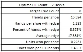 The Optimal LL count was the count uses by the AP mentioned above in Washington State. To understand his earning potential, he was playing a game with the cut card placed a depth of more than 80 cards. He was earning at least 1.857 units per 100 hands. Playing heads-up, getting 200 rounds per hour, with a maximum bet of $100, his expected return was over $370 per hour. No wonder he was so happy.
